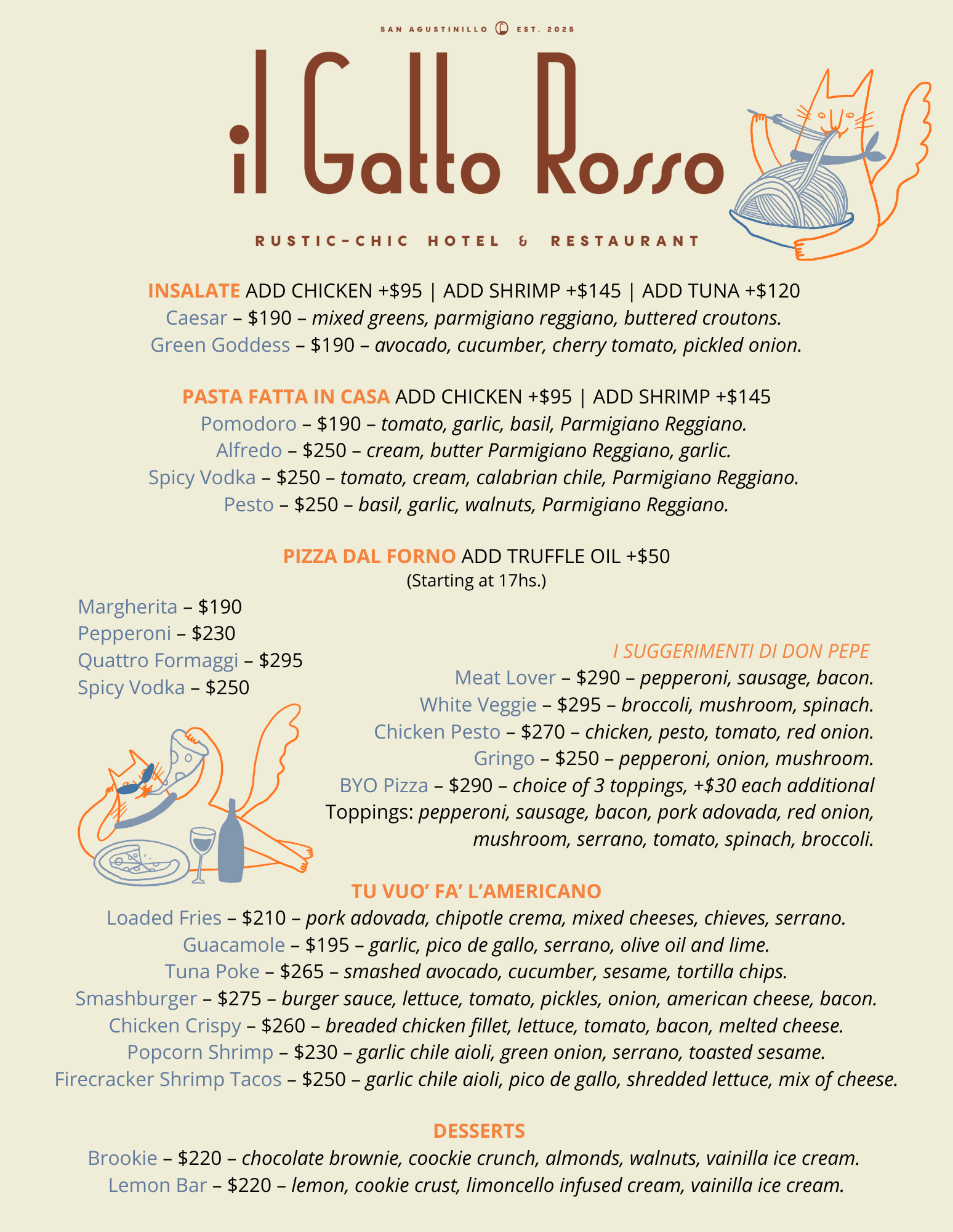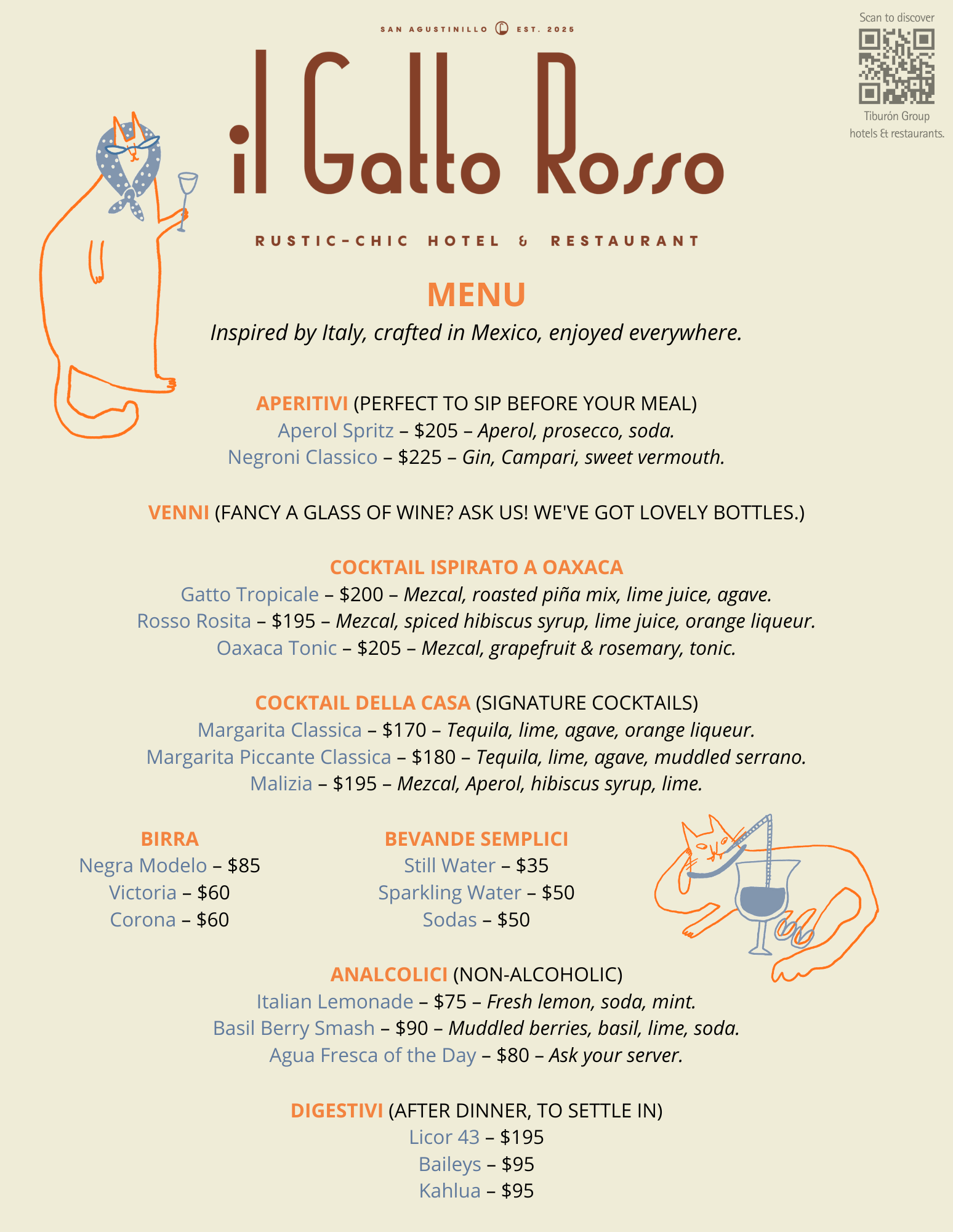 Welcome to Ristorante Il Gatto Rosso — our beachfront restaurant in San Agustinillo celebrates Italian flavors with a Mexican soul and a touch of American comfort food.